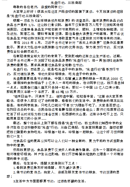 最近,整个社会从上到下都在提倡“光盘”行动,我觉得我们城西中学的全体师生也应该积极参加“光盘”行动,从自己做起,在食堂按需盛饭,每顿钣都把我们碗里的食物吃光,珍惜每一粒米,珍惜每一颗粮食,让这个好习惯伴随我们一生!城西中学党支部副书记徐建明在国旗下讲话中提出:1.看到浪费现象友好地提醒 ,2.尽力减少浪费;做节约的宣传员,向家人、亲戚及朋友宣传节约粮食、节约资源的思想;3.生活中方方面面都要节约,过绿色低碳的生活。