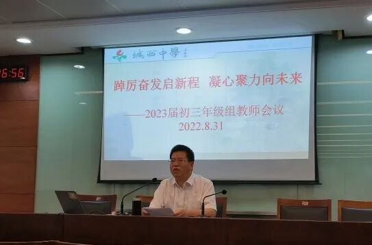 为明确新学年初三工作方向,进一步推进城西中学教育教学高质量发展,8月31日下午,城西中学2023届初三年级教学工作会议在驰目厅召开,初三全体任课教师悉数参加,会议由教务处周常林主任主持。